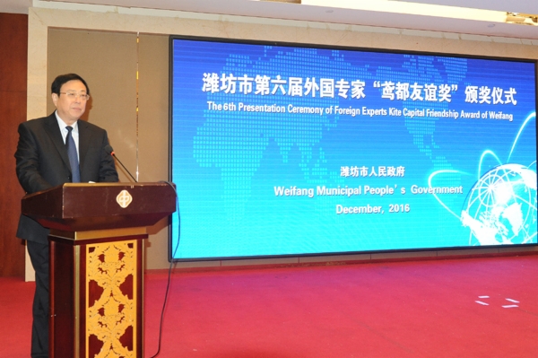 近日,我市举行第六届外国专家“鸢都友谊奖”颁奖仪式,为10名在潍工作的外国专家颁发“鸢都友谊奖”。潍坊市副市长、市政府党组成员刘建国;市政协党组成员,市人社局党委书记、局长李静波出席仪式并为获奖专家颁奖。